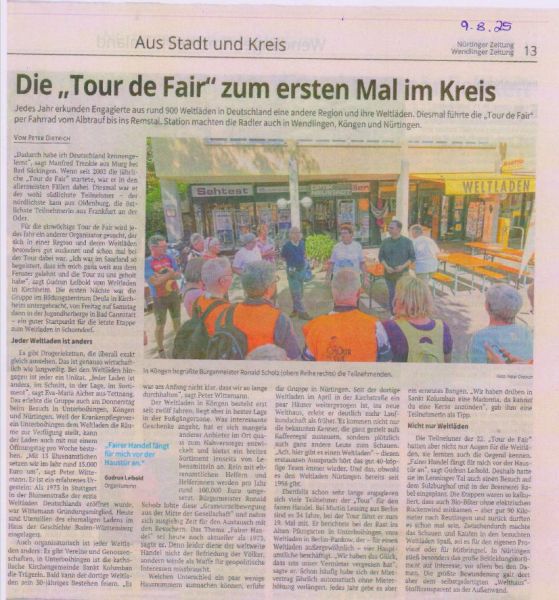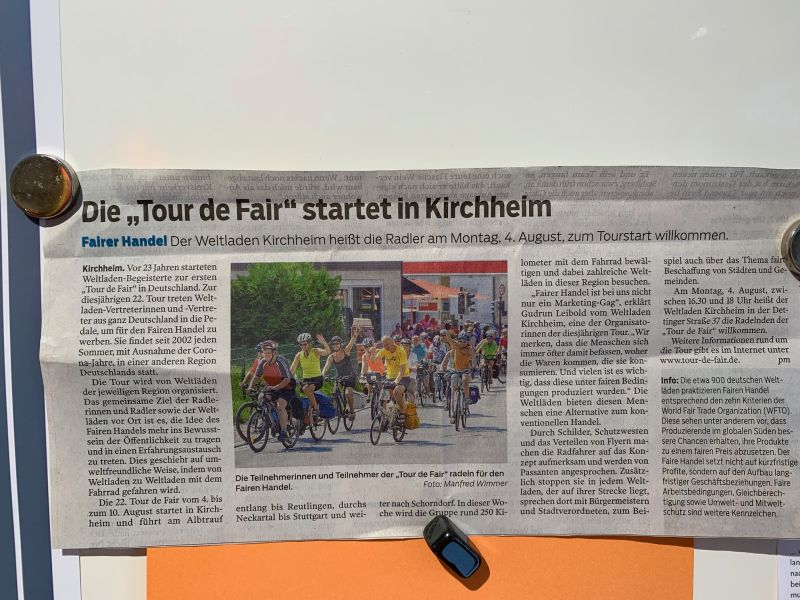 Jedes Jahr erkunden Engagierte aus rund 900 Weltläden in Deutschland eine andere Region und deren Weltläden. Dieses Jahr führte die „Tour de Fair“ per Fahrrad „Von der Albtrauf ins Neckartal“. Es war insgesamt die 22. Tour de Fair in Deutschland.