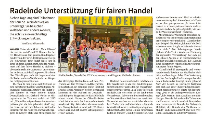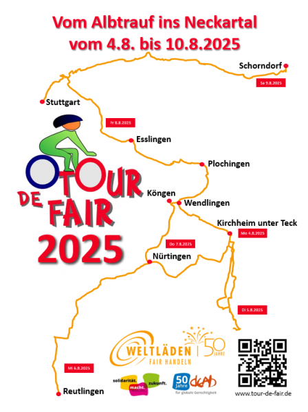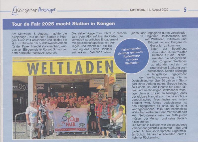 Jedes Jahr erkunden Engagierte aus rund 900 Weltläden in Deutschland eine andere Region und deren Weltläden. Dieses Jahr führte die „Tour de Fair“ per Fahrrad „Von der Albtrauf ins Neckartal“. Es war insgesamt die 22. Tour de Fair in Deutschland.